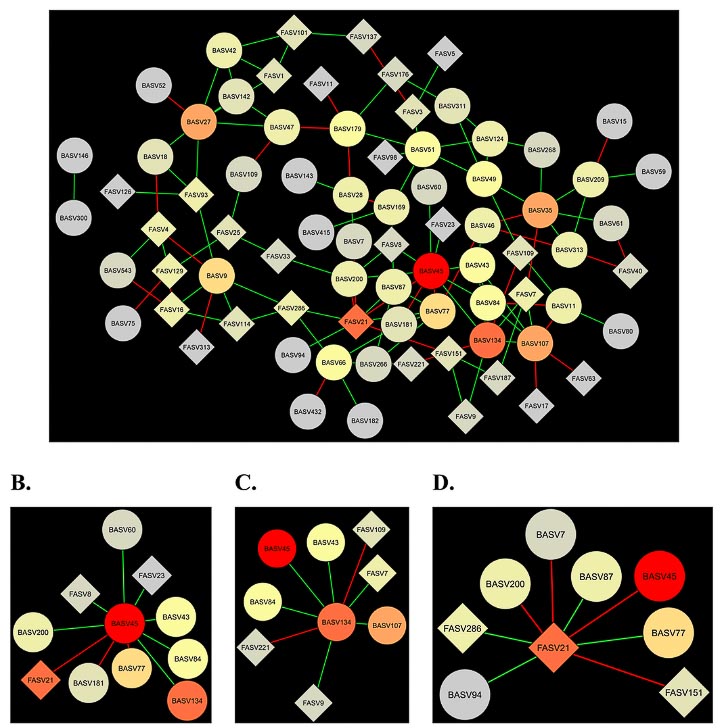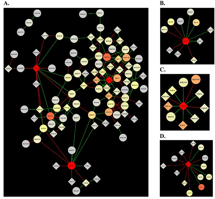 (B) Sub-network centered around BASV45. (C) Sub-network centered around BASV134. (D) Sub-network centered around FASV21.