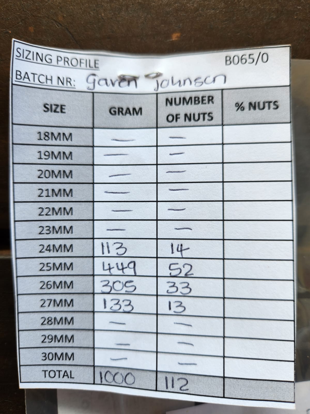 Hi Gavin. Congradulations are in order… 😁😁👏👏👏 This is really exceptional quality. There are zero defects and your Total SKR% Sound Kernel Recovery is 34.2%. Impressive for Beaumonts in our region . The color of the kernels is also excellent. The Nut In Shell looks very good, regarding both color and shape conformity. The sizing profile on the Nut in shell NID is the best we have seen so far this season on any variety…. and far better than anything delivered for the last 5 years at least. Nothing less than 24 mm in size and a even spread in size peaking at 25 mm and 26 mm. Otherwise theres not much else to expand on, other than to say, keep doing what you are doing.